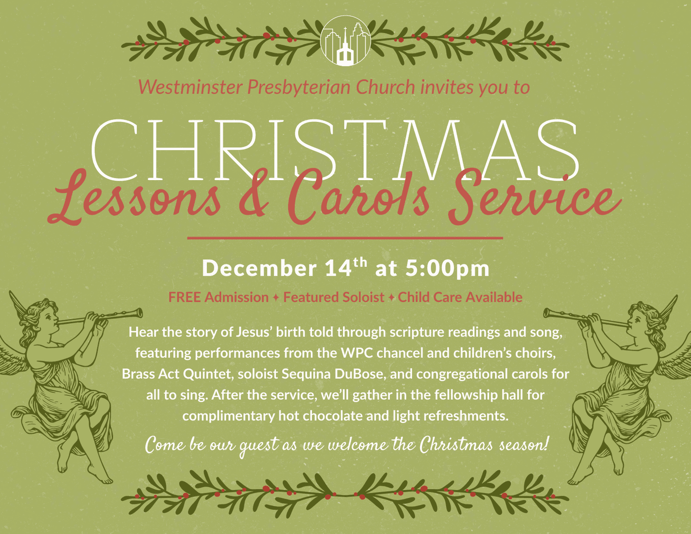 Our annual Festival of Lessons and Carols from December is now available to watch on video; so if you missed out on attending, or just want to hear it all again, or even share it with a friend, click on the button below to watch. We are grateful to all the participants, helping hands, and our wonderful WPC production team for the joyful evening of worship, and the ability to enjoy it again with the gift of technology!